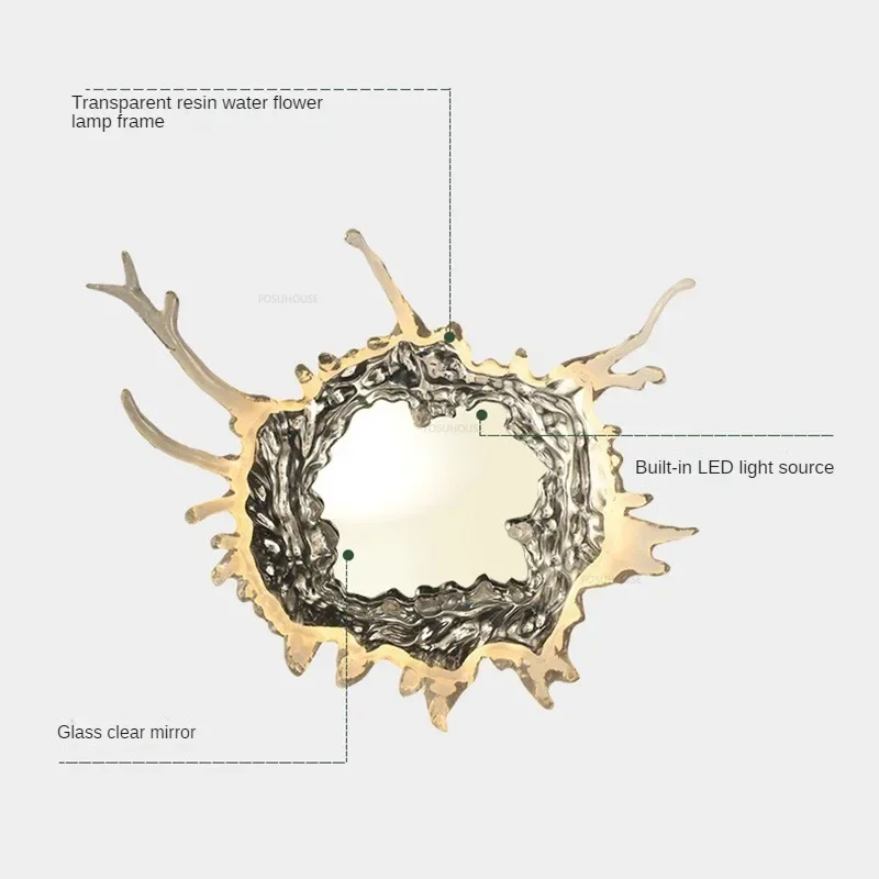 European Style Resin Art Water Splash Decorative Wall Mirror with Light for Bathroom and Dresser