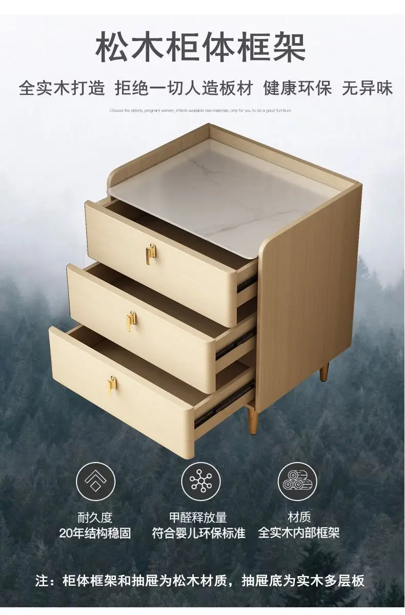 Solid Wood Bedside Table with Drawers and Rock Slab Countertop Nightstand for Bedroom Furniture