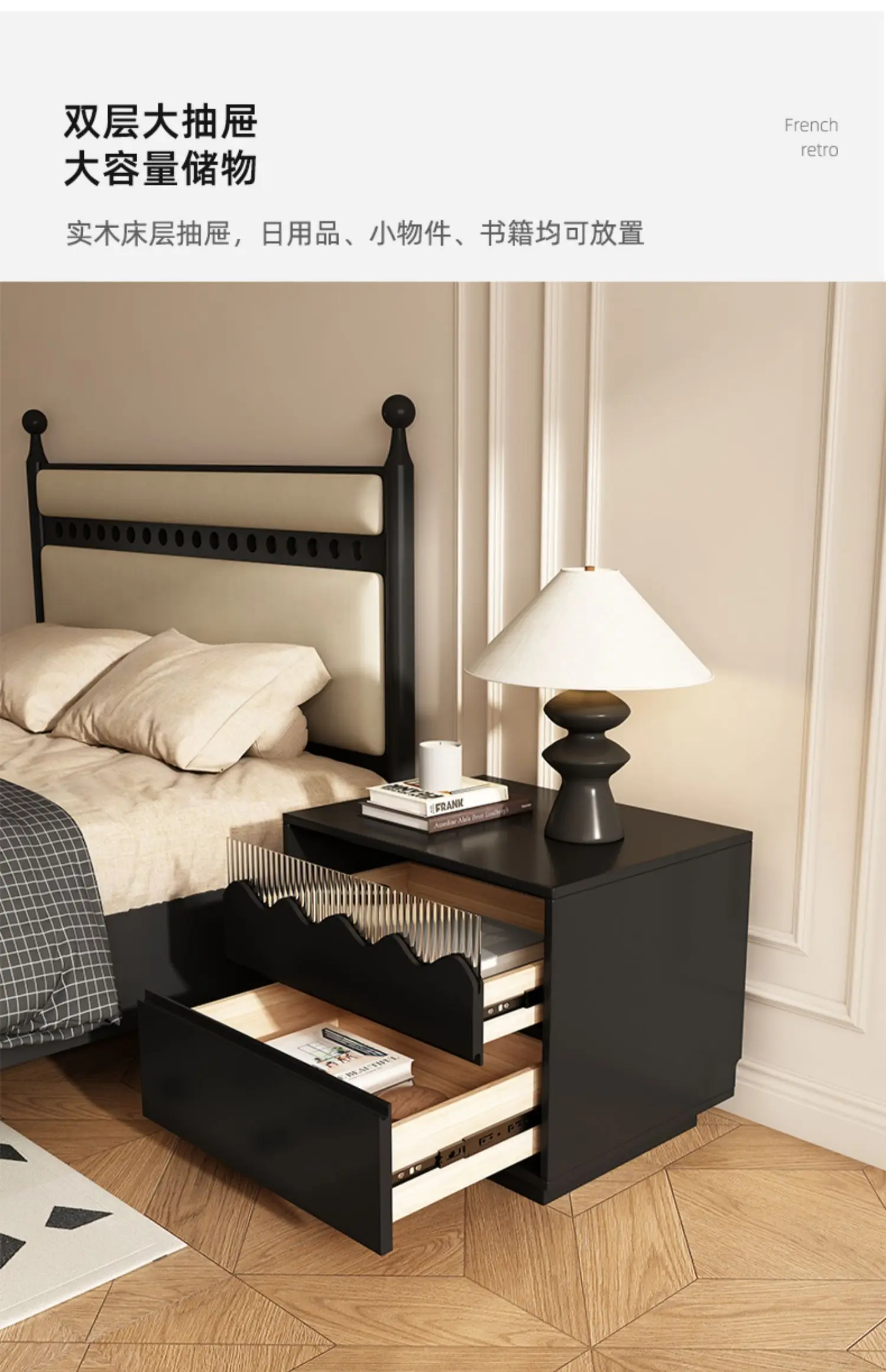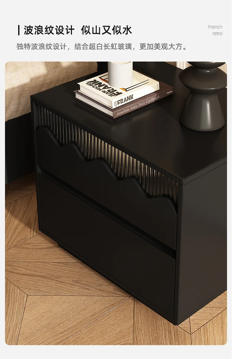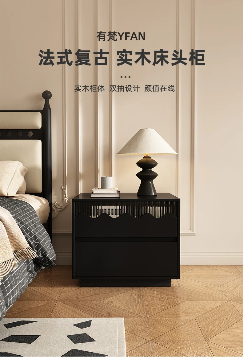 Retro Style Black Oak Wooden Nightstand with Rubber Wood Drawers - Modern Home Furniture